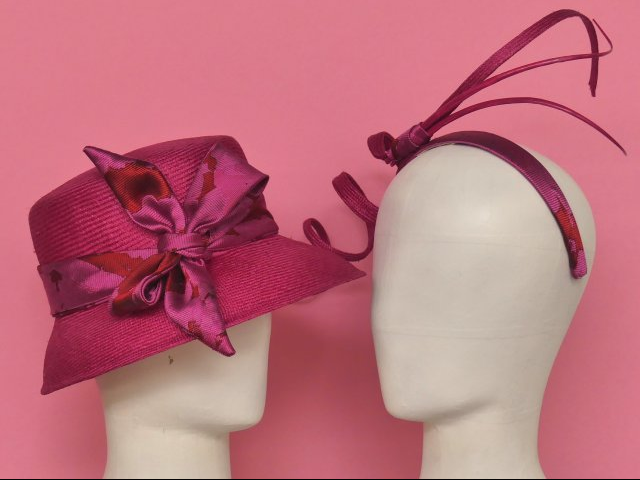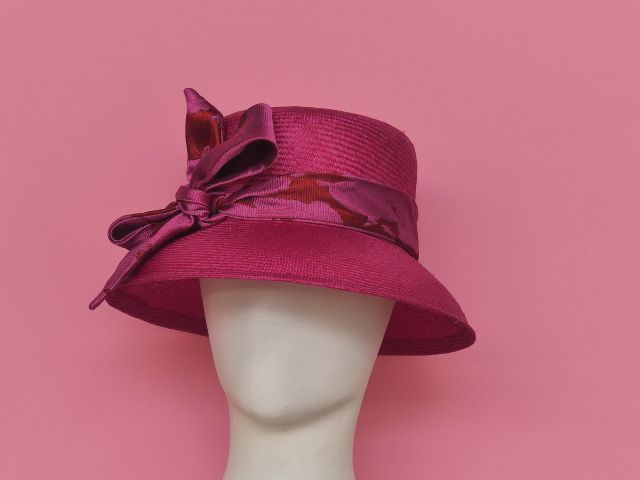 Chapeau cloche en parasisal rose fushia garni d’un tour de calotte ne tissu jacquard à motif floral assorti. ce chapeau retro donne de l’allure a votre robe d’été et vous protège du soleil élégamment. réalisable dans toutes les couleurs, il convient bien au visage ovale et souligne le regard.